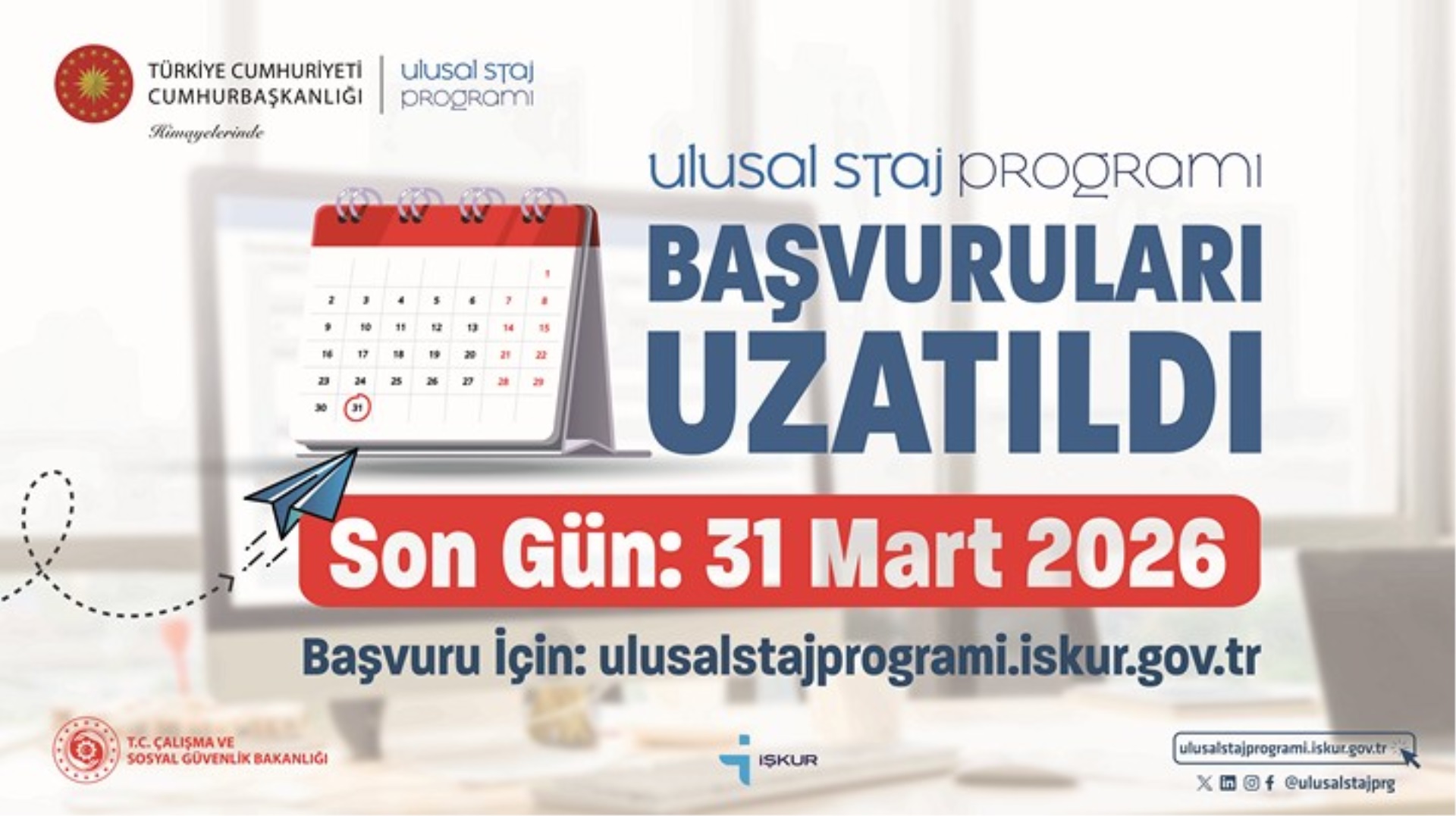 Cumhurbaşkanlığı Himayelerinde Türkiye İş Kurumu (İŞKUR) koordinasyonunda 2026 yılı “Ulusal Staj Programı” öğrenci başvuruları 06 Ocak 2026 tarihinde başlamış olup 31 Mart 2026 tarihi saat 23:59’a kadar devam edecektir.